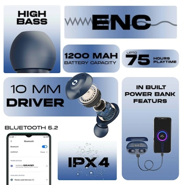 HOPPUP GRAND TWS is a revolution in itself, with the features and functions of a True Wireless Earbuds, it never lets your energy level to go down as it is designed to work as a power bank as well. It's full power pack energy delivers an immersive sound quality along with passive noise cancellation. Experience the joy of unstoppable music with up to 75 hours of playtime with HOPPUP GRAND that stands true to its name in every way. These wireless earbuds offer easy button controls and resistance to sweat and dust. HOPPUP GRAND is a true live life grand size experience.